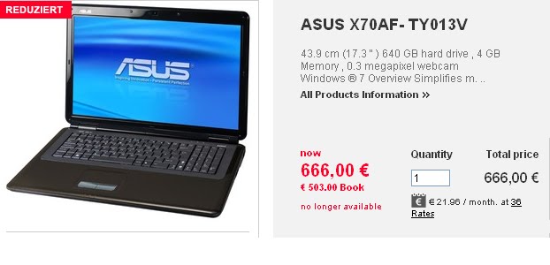 I was thinking last time whether to order a DSLR camera or a new Desktop or laptop. I decided to order a laptop last week because I always use it everyday. just need a new one because the old one desktop that I have is processing very slow now. I am currently using my small ACER Aspire One netbook. I don’t like it that much because the screen is so small. Hubby has an HP laptop with Windows Vista program but I also don’t like it. The solution to my problem is the new Asus laptop that I ordered last week. I believed I am very lucky because I have it for a cheaper price. It normally cost 1,169 euros but I had it for 666.00 Euros. Today, I took a look at it again in the website where I ordered it and it is no longer available. I hope to have it in the next days.